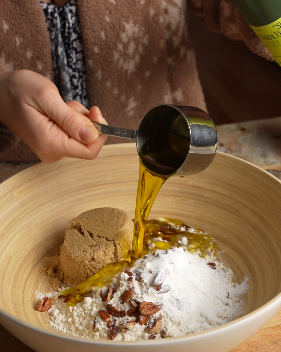 To make the crumble, thoroughly mix 1¼ cup flour, ⅔ cup brown sugar, ¼ cup pecans or walnuts, 1¼ tsp baking powder, and 1 tsp kosher salt in a medium bowl.