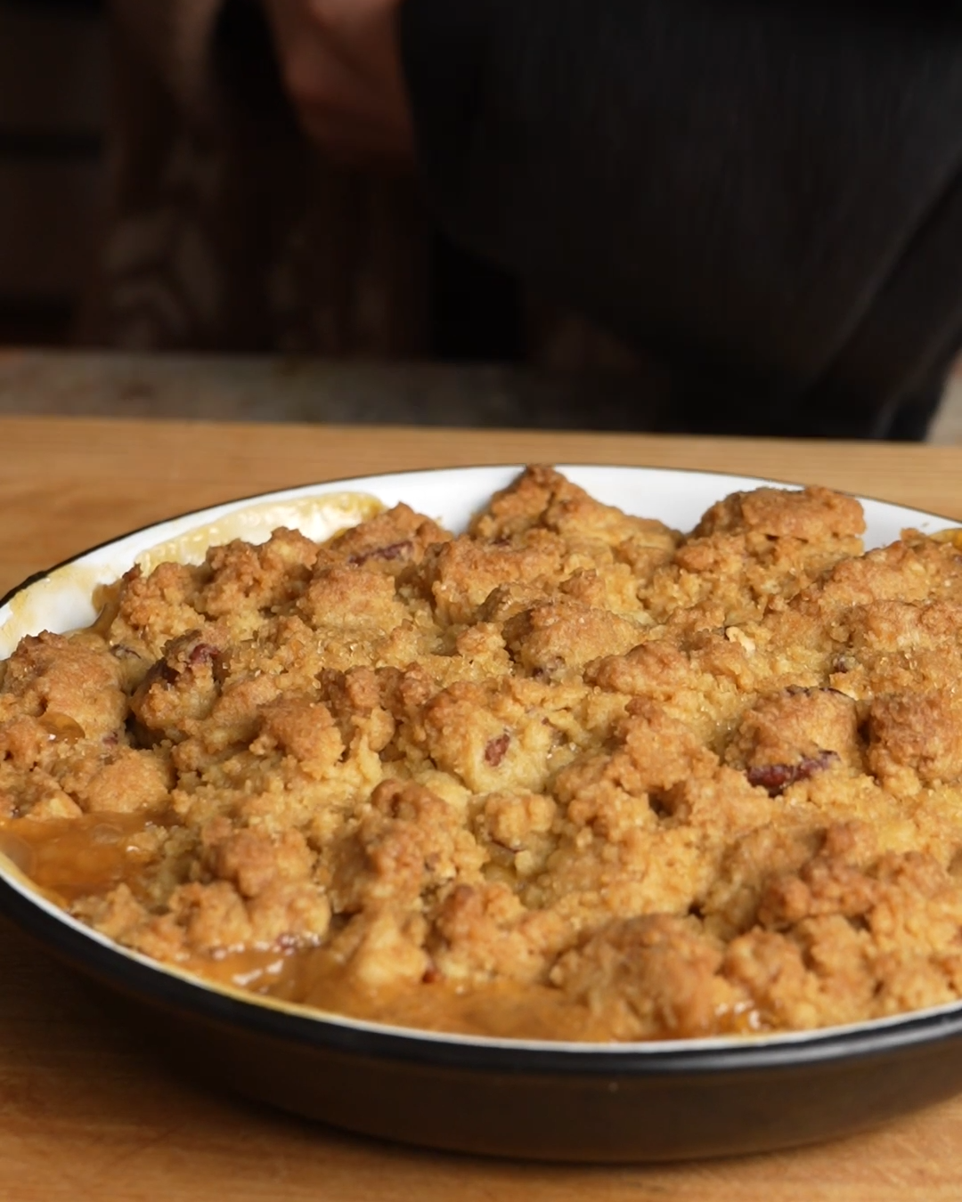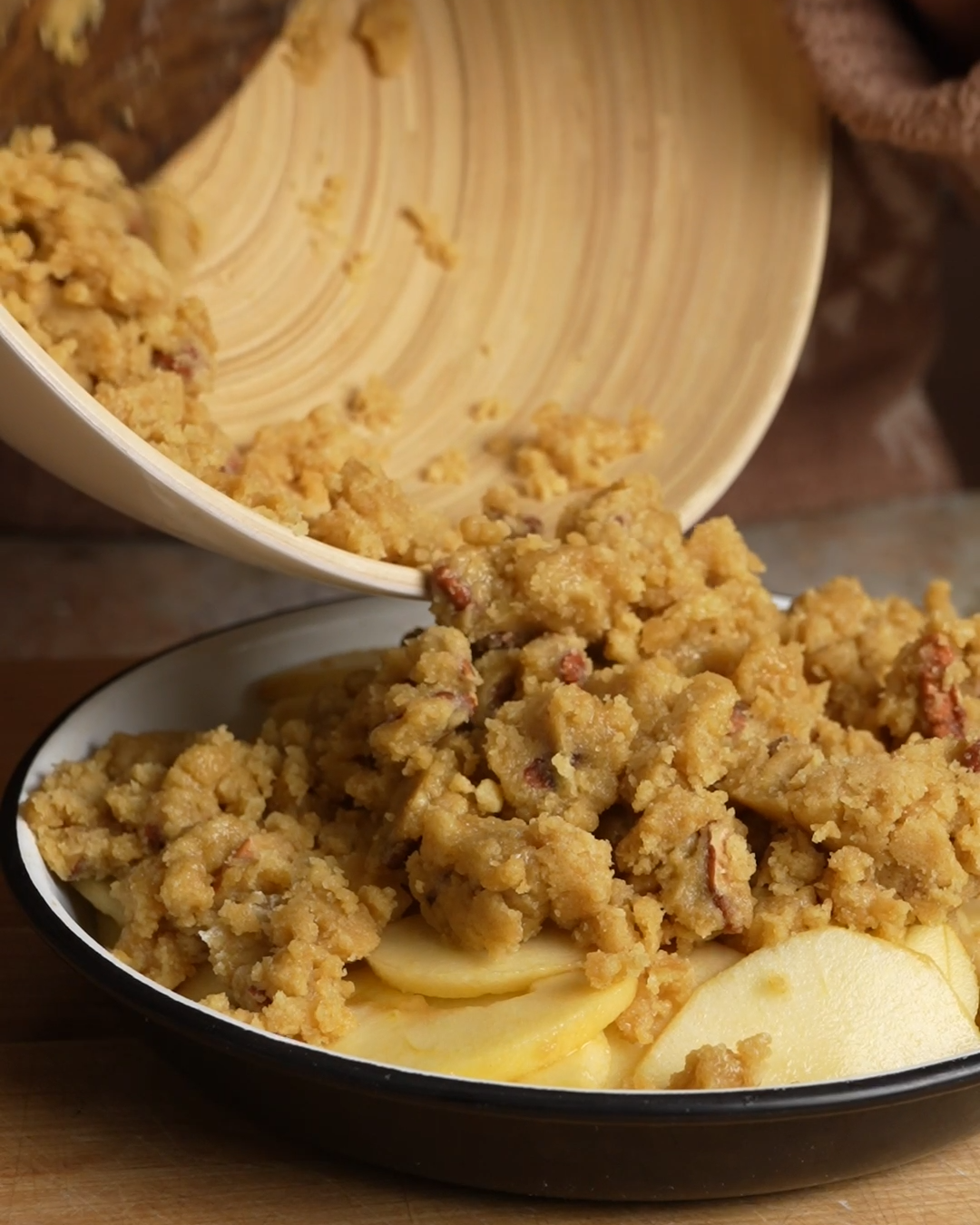 Evenly distribute crumble mixture over apples and dust with a tbsp or so of granulated or turbinado sugar.