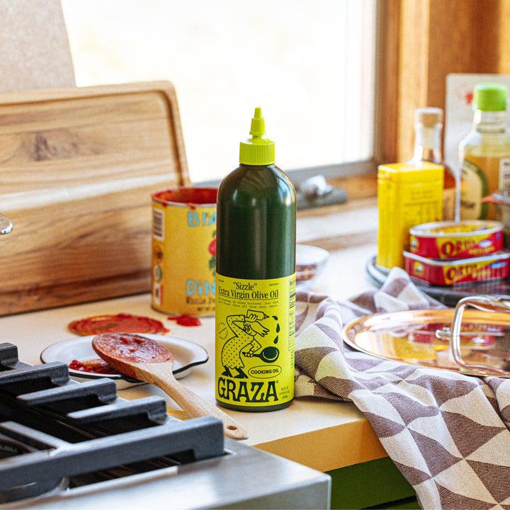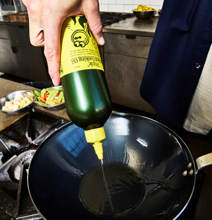 With its neutral flavor and high smoke point, Frizzle can handle some serious heat. Reach for Frizzle when you’re cooking at a super high temp, or don’t want an olive oil-y flavor.